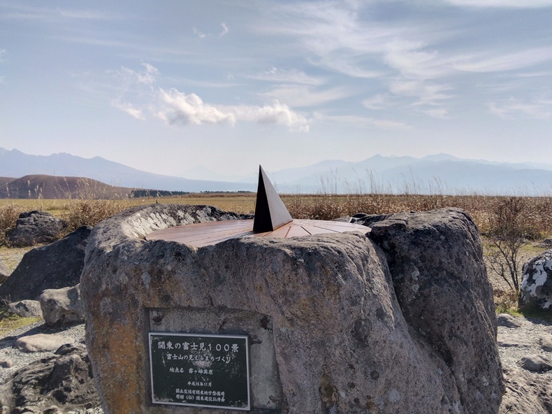 三角錐の頂点から左に線を引いて、『関東の富士見100景』というプレートの真ん中から上に線を引いて交わるところらへんに、うっすら三角の山があるように見えます。