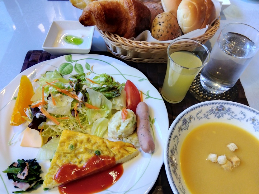 - 朝食は窓際の緑が美しく、パン3種とスープで旅の活力が湧く